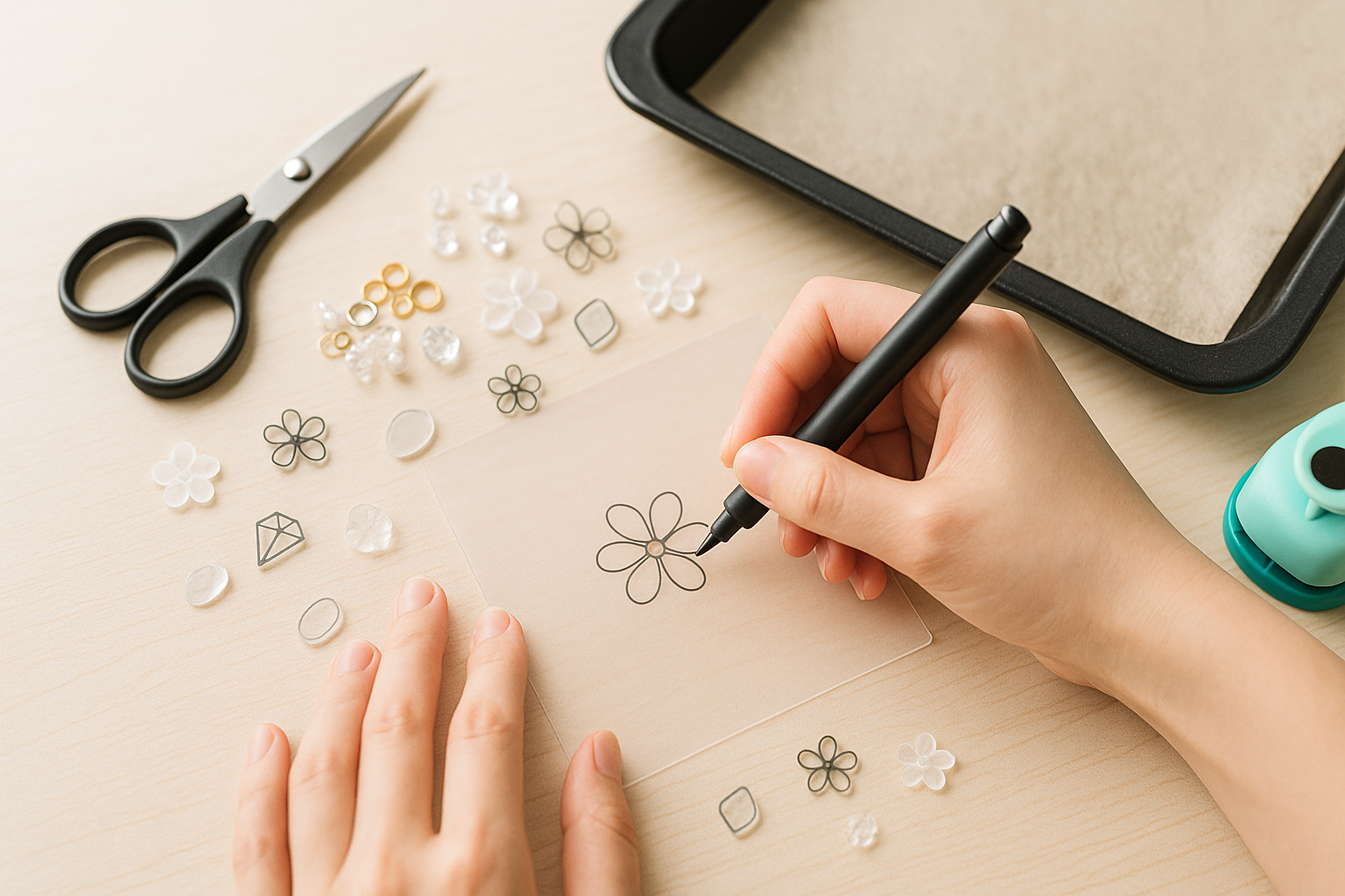基本セットはシンプルです。プラバンシート、描画用のペン(油性ペンや色鉛筆対応のタイプ)、はさみまたはカッター、穴あけパンチ(キーホルダーにする場合)、耐熱シート(クッキングシートなど)、平らなトレイ、そして重しになる平板(厚めの本や平らな板)があればOK。仕上げに使うレジン風コーティング剤やトップコート、丸カン・金具などは、作りたいアイテムに合わせて選びます。