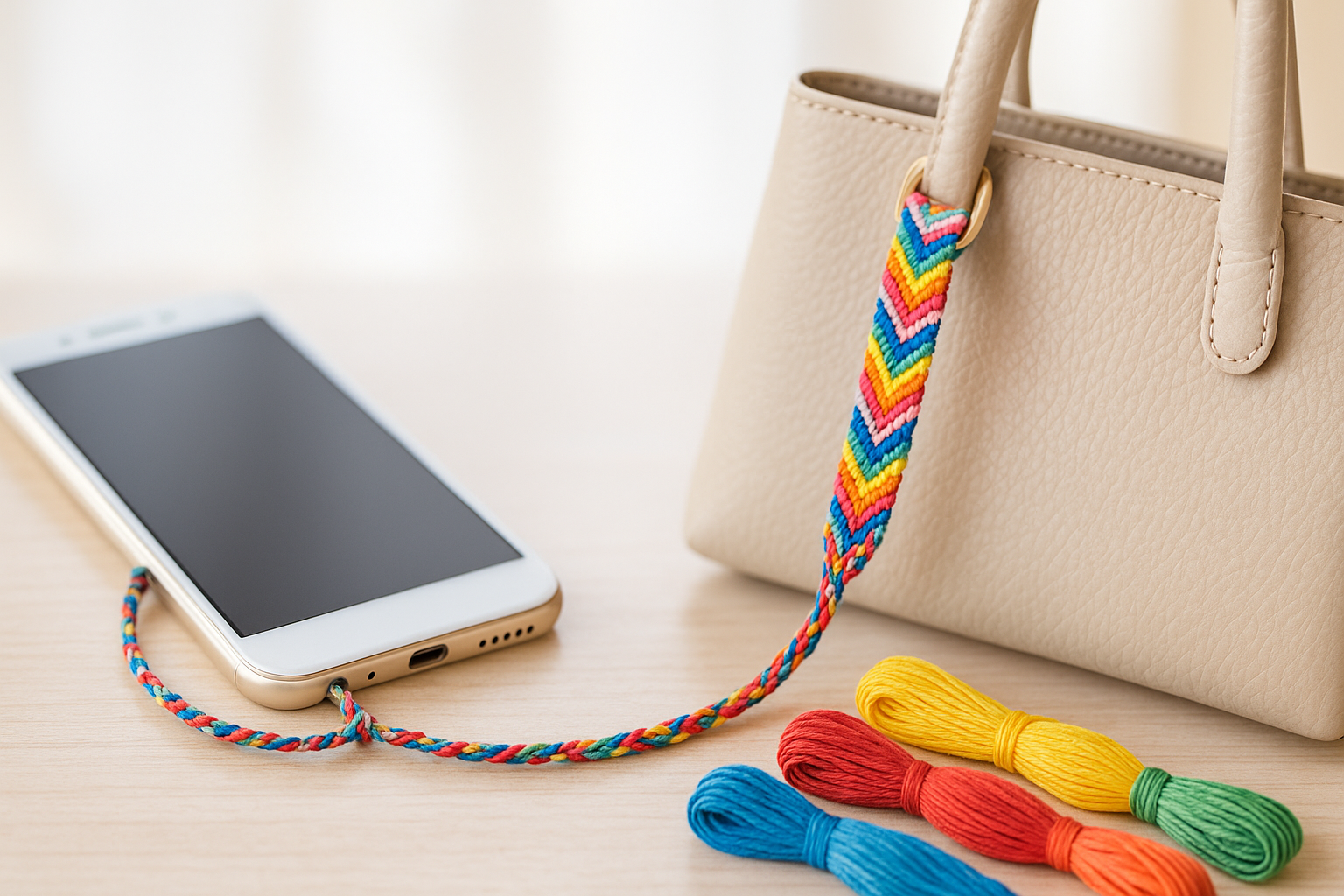 スマホリングやカメラカバーに、小さなタッセルを合わせると揺れ感が加わり、手元が華やかに。ケース側面のストラップホールがある場合は、二重リングで強度を確保してから結ぶと安心です。細い三つ編みと四つ編みを重ねると、さりげなく立体感が出ます。普段使いには、バッグの中で引っかかりにくい5~8cm程度の短めストラップが扱いやすいですよ。