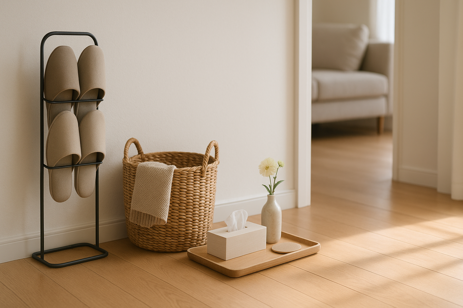 無理しないおもてなしとは、背伸びをしない範囲で、安定して続けられる準備のこと。完璧な演出を目指すより、普段の生活をベースに、必要なものを必要な場所に置く。お客さまの動線と、家族の動線がぶつからないように設計しておく。これだけで、当日の負担は大きく変わります。たとえば、玄関の腰高の位置に来客用スリッパを重ねず立てて収納する、洗面台にゲスト用の手拭きとペーパータオルを見つけやすく置く、リビングの一角に荷物置きのバスケットを用意しておくなど。小さく整えるの積み重ねが、お互いに居心地のよい時間につながります。