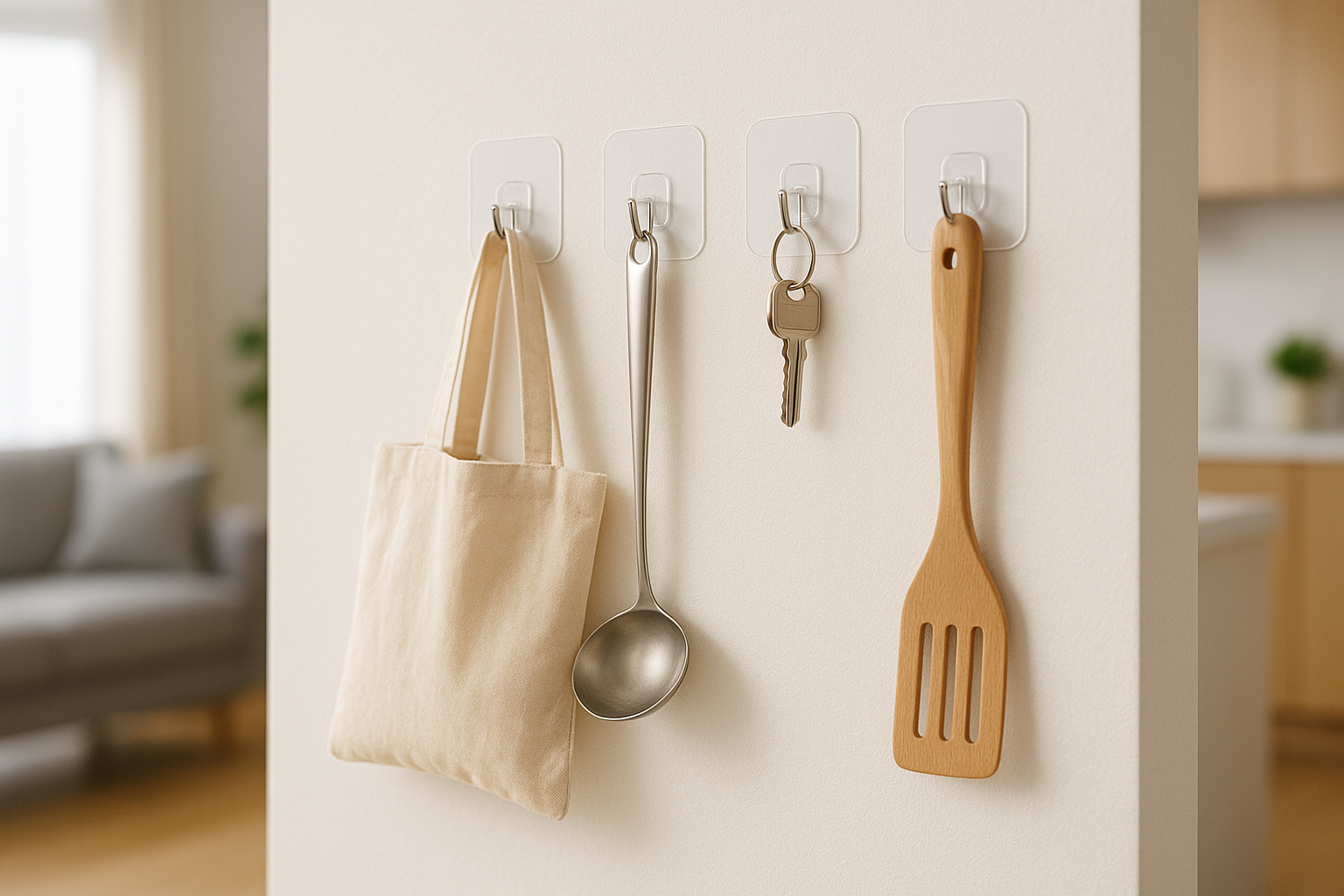 特に変化を感じやすいのは、玄関・洗面所・キッチンなど、スペースが限られている場所です。例えば玄関では、透明フックをドア横に貼ってエコバッグや折り畳み傘を掛けておくと、「どこに置いたっけ?」という探し物が減ります。洗面所では、ヘアゴム・ヘアブラシ・小さなポーチをフックに掛けるだけで、カウンターのごちゃつきが一気に解消されます。