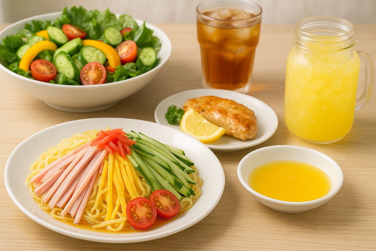 冷やし中華は、夏のさっぱりランチの代表格です。麺類の満足感がありつつ、具材にきゅうりやトマト、錦糸卵を使うことで見た目も涼しげになります。外食チェーンや町中華、コンビニなど、さまざまな場所で選びやすいのも魅力です。
