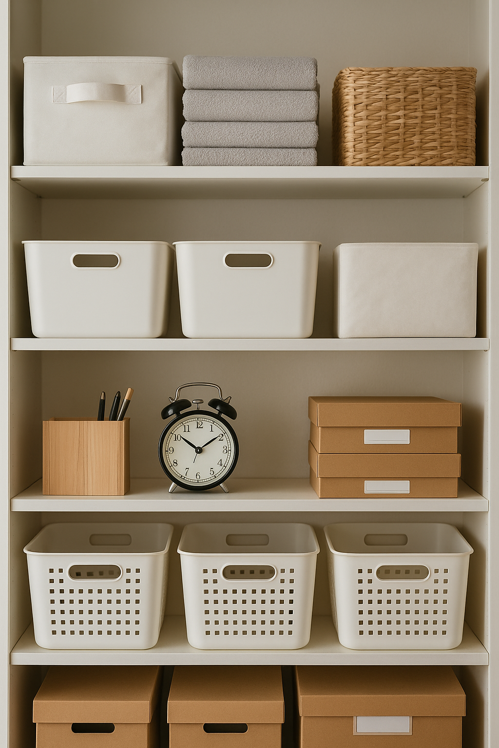 特に、棚の中に「空間の余白」が多い場合は、追加の棚板やスタンドで上下を分割すると、一気に収納量が増えます。新しく大型家具を増やす前に、まずは既存の収納を細かく区切ることを試してみてください。