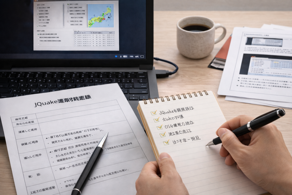 この記事では、JQuakeの通知が来ないときにありがちな原因を整理しながら、Windows・macOS・Linuxごとの確認ポイント、JQuake内で見直したい設定、再発防止の記録方法までまとめて解説します。