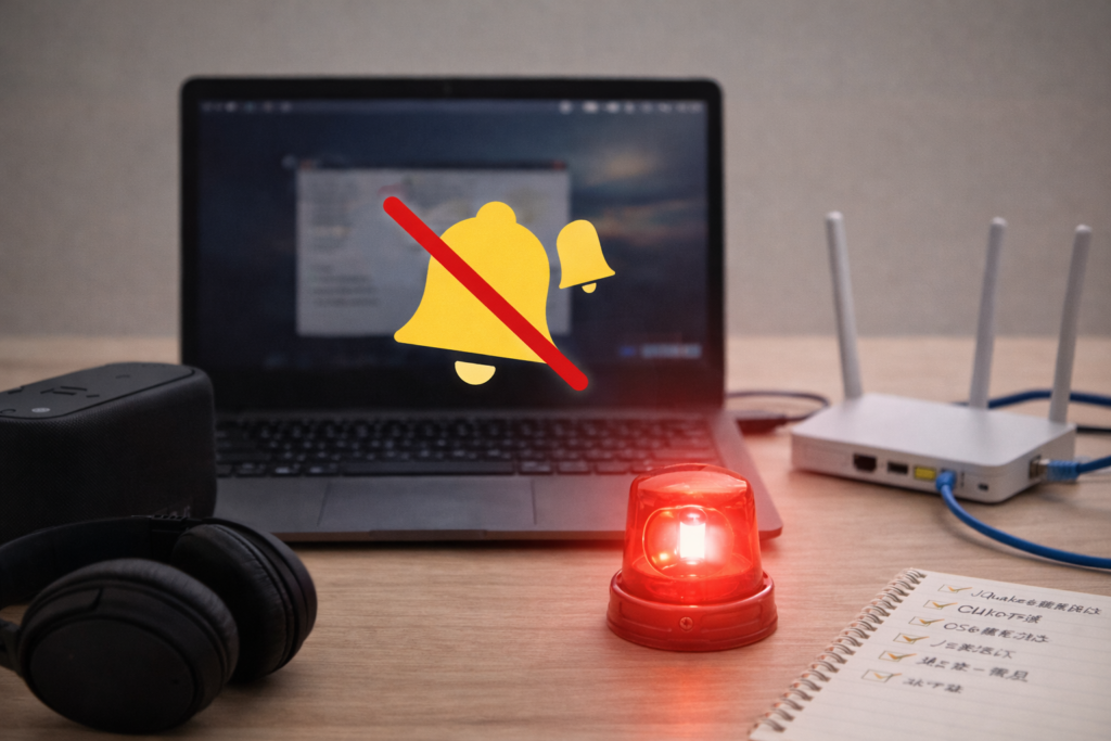 会議用ヘッドセットやモニター内蔵スピーカーに自動切替されると、通知が消えたように感じやすいです。