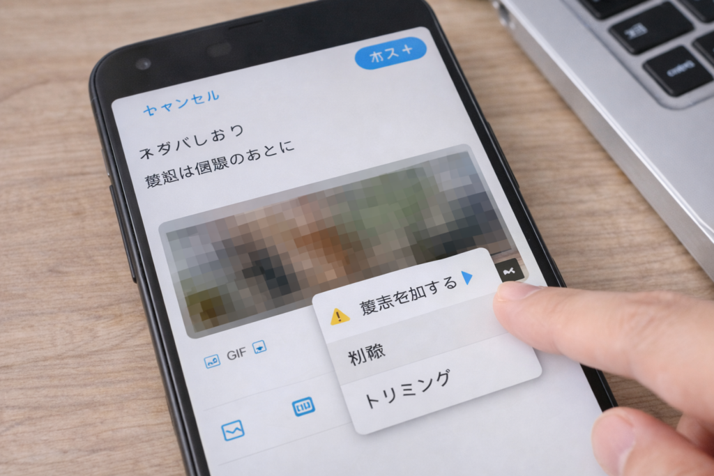 環境によって表示が少し違うことはありますが、画像編集時に警告やセンシティブ設定の項目を選び、保存して投稿する形になります。