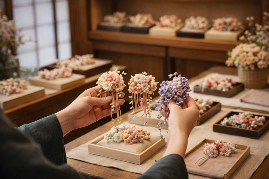 京都の花かんざしが多くの人の心をつかむのは、見た目の華やかさだけでなく、素材や技法に細やかな工夫があるからです。