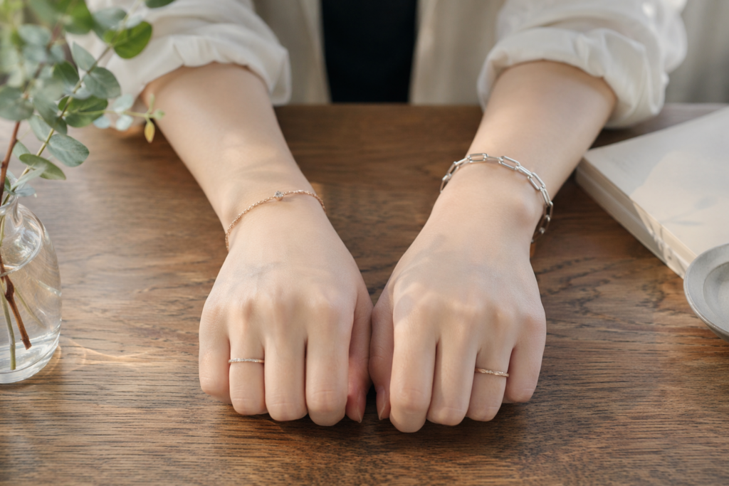 同じ手に重ねたい場合は、細めのチェーンや華奢なデザインを選ぶと上品です。