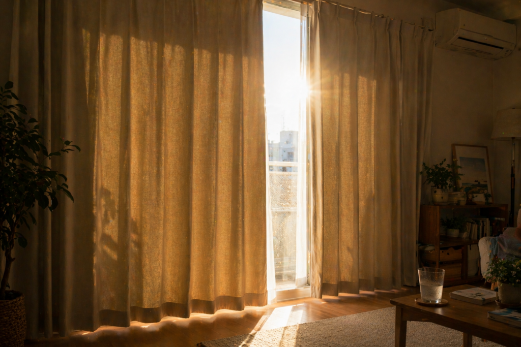 この記事では、カーテンを閉め切る効果の仕組みから、効果が出る条件、逆に限界が出る場面、さらに換気やエアコンとどう組み合わせるべきかまで、実践目線でわかりやすく整理します。