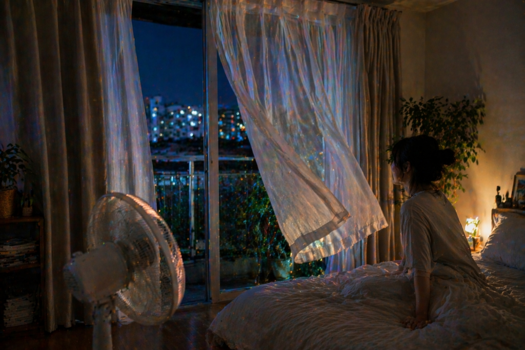 - 夜でも蒸し暑い日は、無理に窓開けだけで済ませず、扇風機やエアコンを併用したほうが快適です。