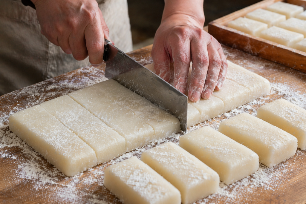 台にくっつきにくいように打ち粉や片栗粉を薄く使い、四角く整えてから同じ幅で切ると、サイズが安定します。