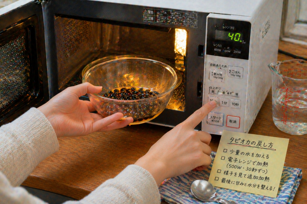 冷蔵後に硬くなったタピオカは、完全に元通りにはならなくても、再加熱で食べやすさを戻せることがあります。