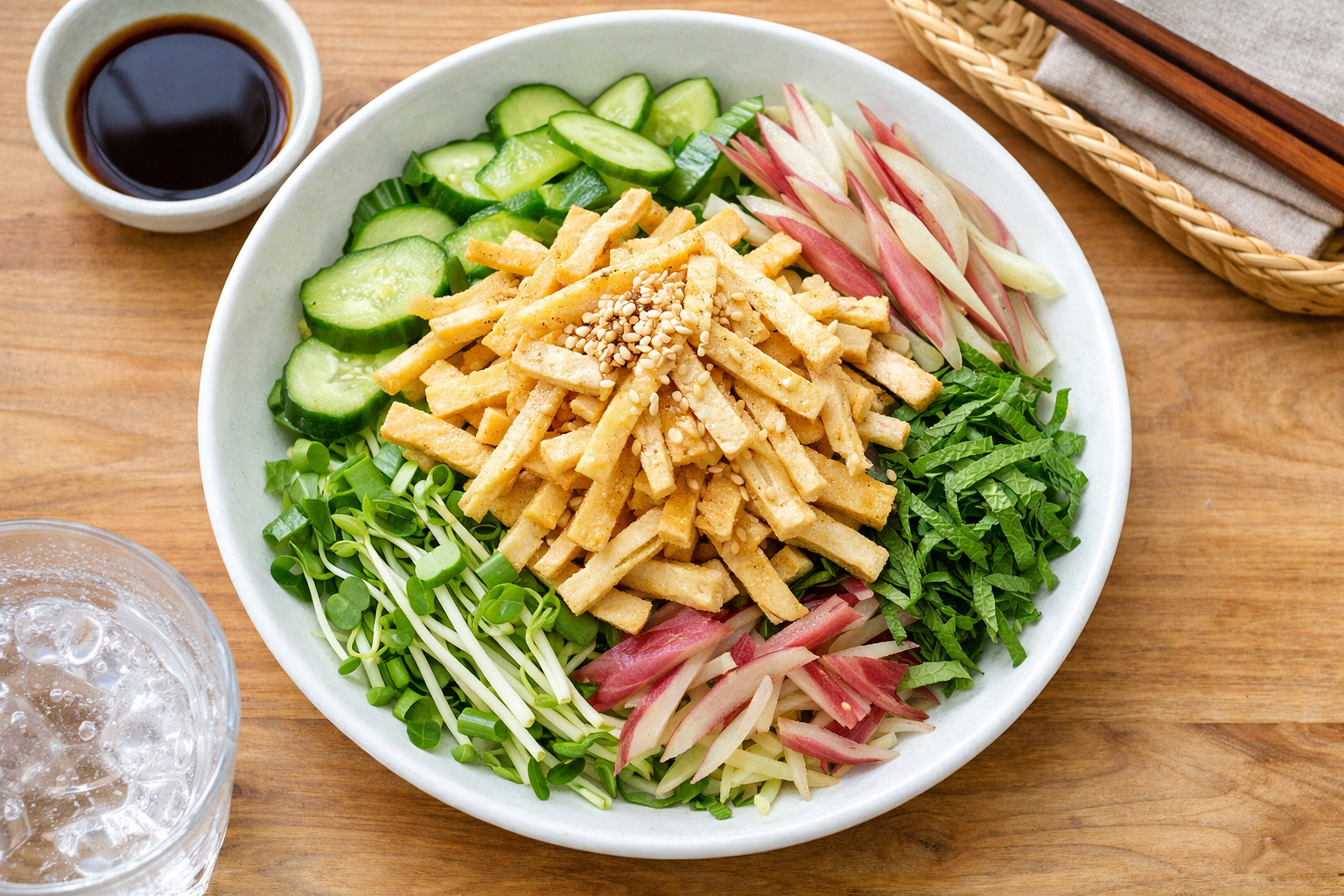 細切りにした油揚げを、きゅうり、大葉、みょうが、かいわれなどと合わせると、香りの強い薬味が油っぽさをやわらげてくれます。