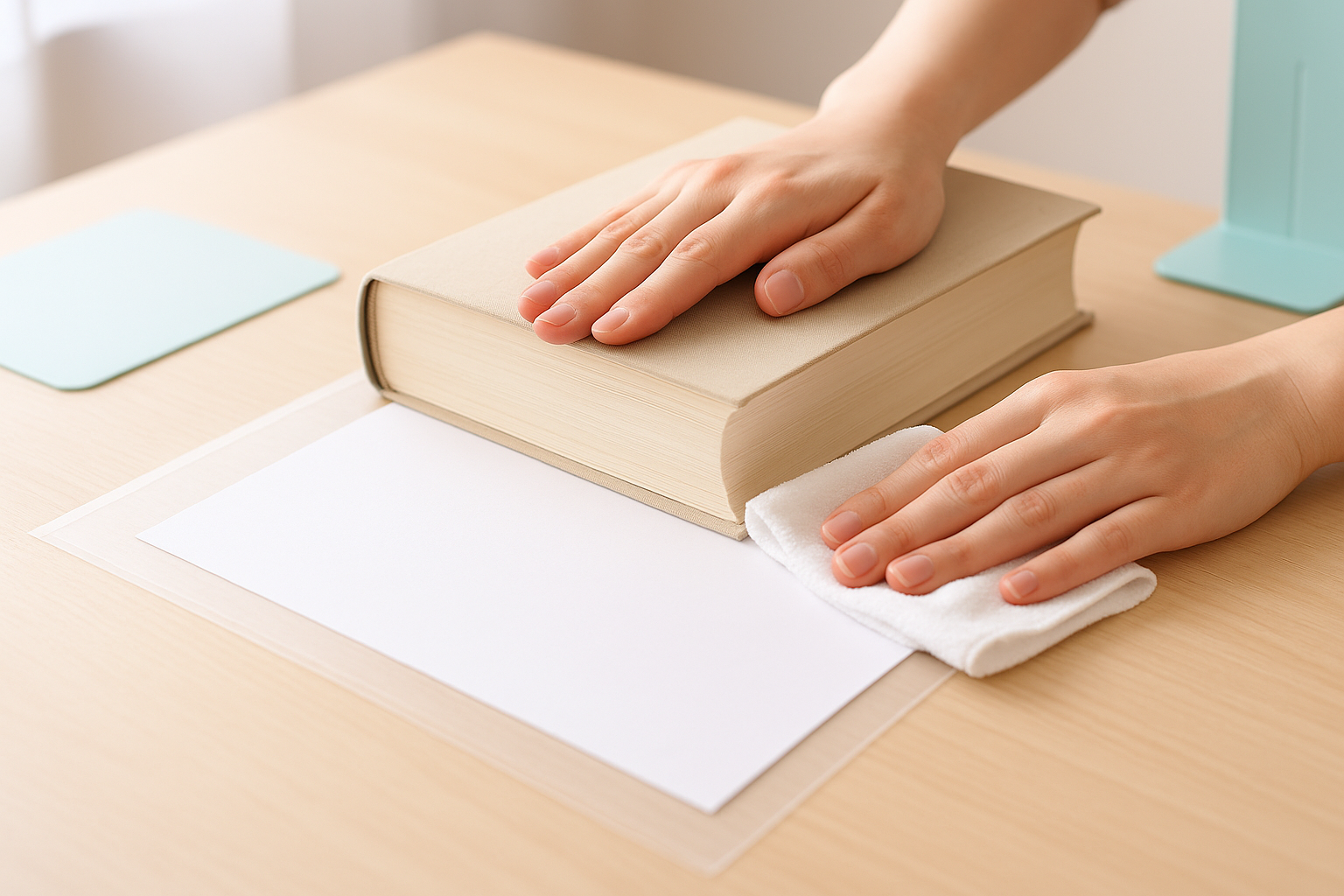 「家にあるもので完結したい」派さんには、大判の本+透明なファイルの組み合わせが気楽です。透明ファイルに入れることで、紙の端が守られ、重みも均一に伝わります。上に置く本は、背表紙が太く、ページが平らに閉じるものを選ぶと安心。ゆっくり時間をかけるほど、手触りがフラットに感じられます。